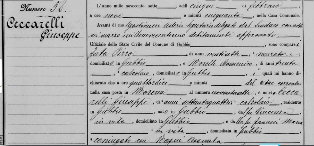 Bernardino RAGNI è infatti il più antico antenato conosciuto e siamo passati a suo figlio Domenico e al figlio di Domenico di nome Gioachino. Si potrebbe stabilire che Bernardino, nato probabilmente nel 1737, fosse morto nel 1802 perché una menzione nell’atto di matrimonio del 29 gennaio 1802 a GUBBIO, di Maria Angela RAGNI, sua figlia, con Domenico CICCIA, precisa che Maria-Angela è la figlia del fu Bernardino.
