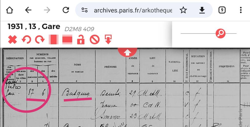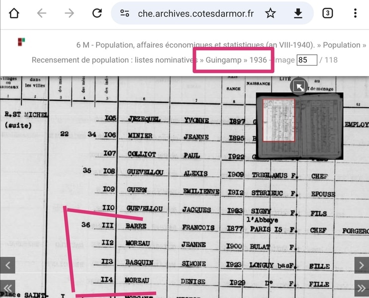 Jeanne-Marie BASQUIN a fait la connaissance de François BARRE natif de Paris 14ème) à REHON (54). Un enfant Denise MOREAU naitra à LONGWY le 21.02.1929. L’enfant porte le nom de MOREAU car reconnu uniquement par la mère. Le couple s’installera à PARIS en 1931 comme le montre le recensement parisien ci-dessous, puis retour à Gingamp en 1936 (cf recensement Guingamp en 1936) où on note que François BARRE vivait avec Jeanne MOREAU et ses 2 filles Simone et Denise. Denise MOREAU est décédée à COAT-REVEN(22) le 12 novembre 1993.