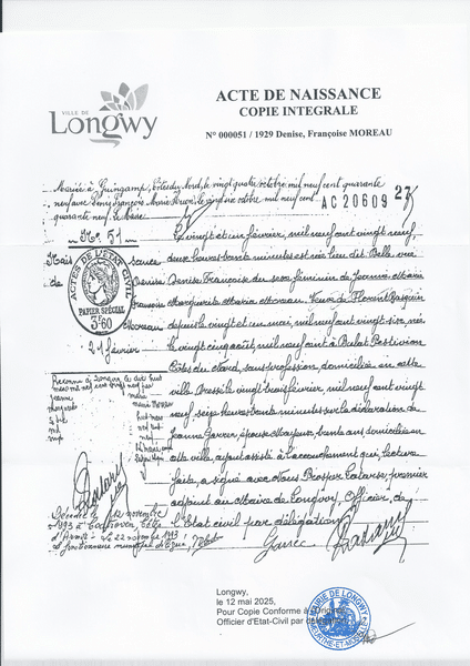 - Yvonne Marie Joséphine MOREAU née le 22/2/1898 à NANTES et décédée le 5/10/1987 à SAINT AGNAN, mariée le 18/3/1922 (Paris 13eme) à Emile Eugène HUGUET né le 17/2/1898 à PARIS 13ème et décédé le 27/2/1935 à PARIS 5eme. Le couple a eu enfants qui sont mes petits cousins :